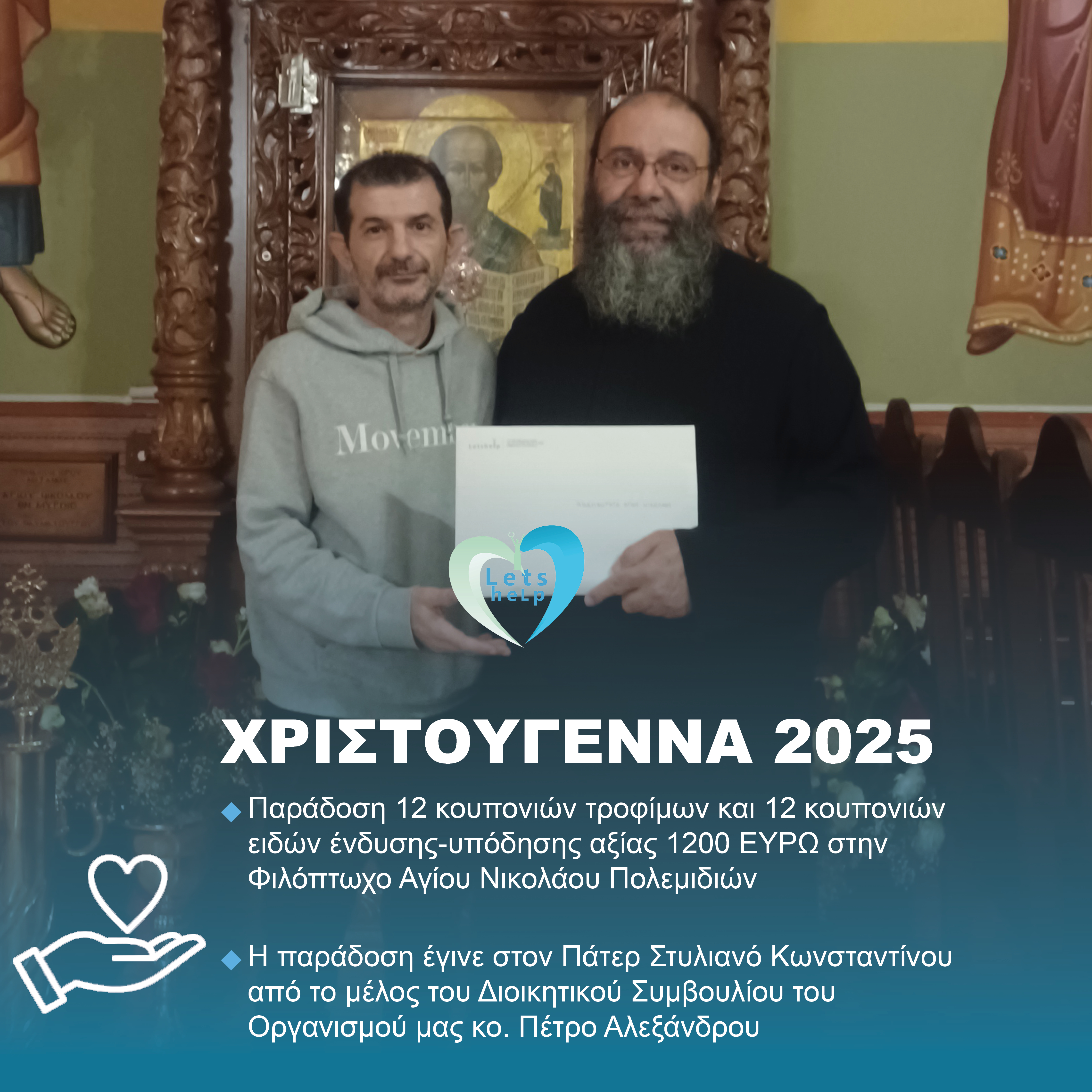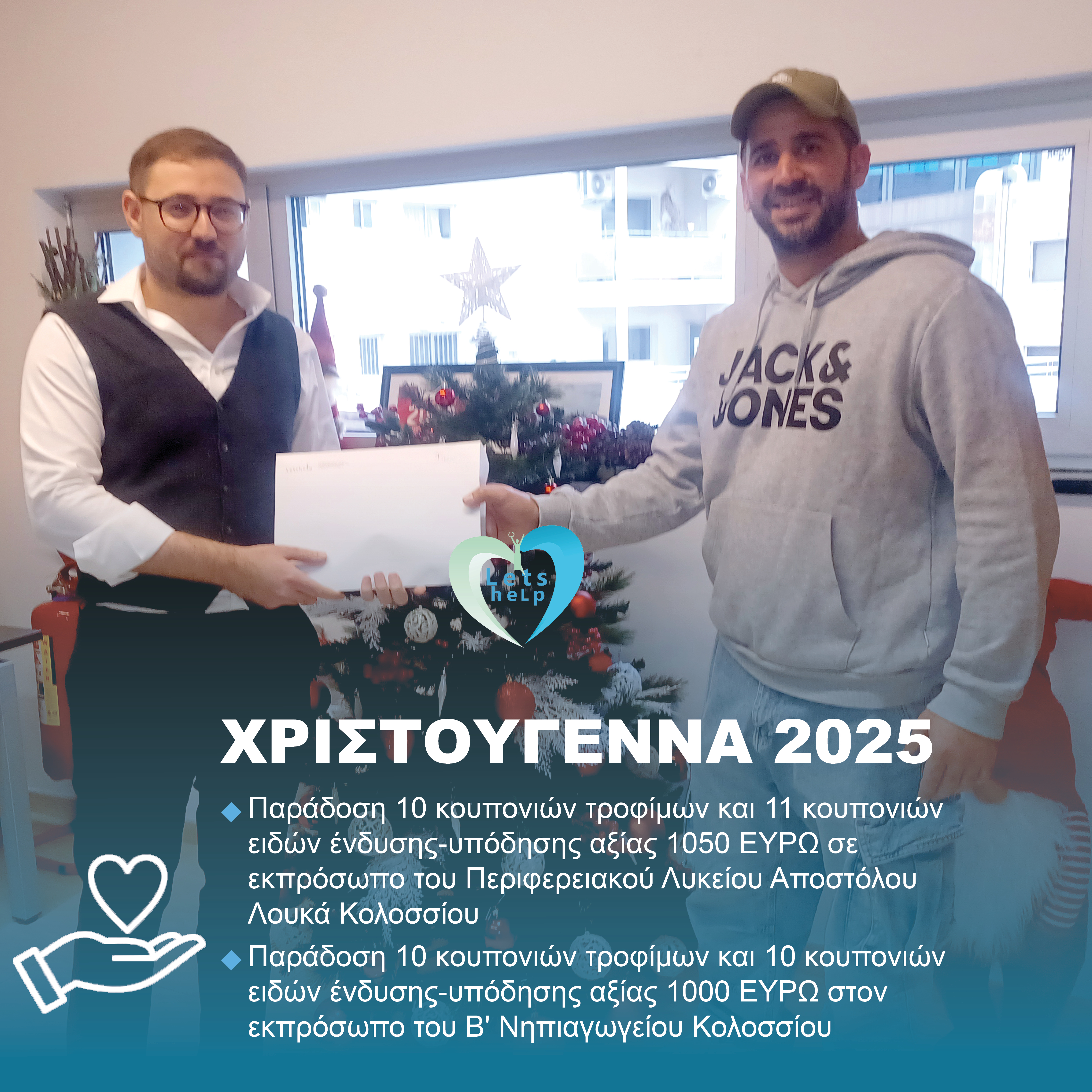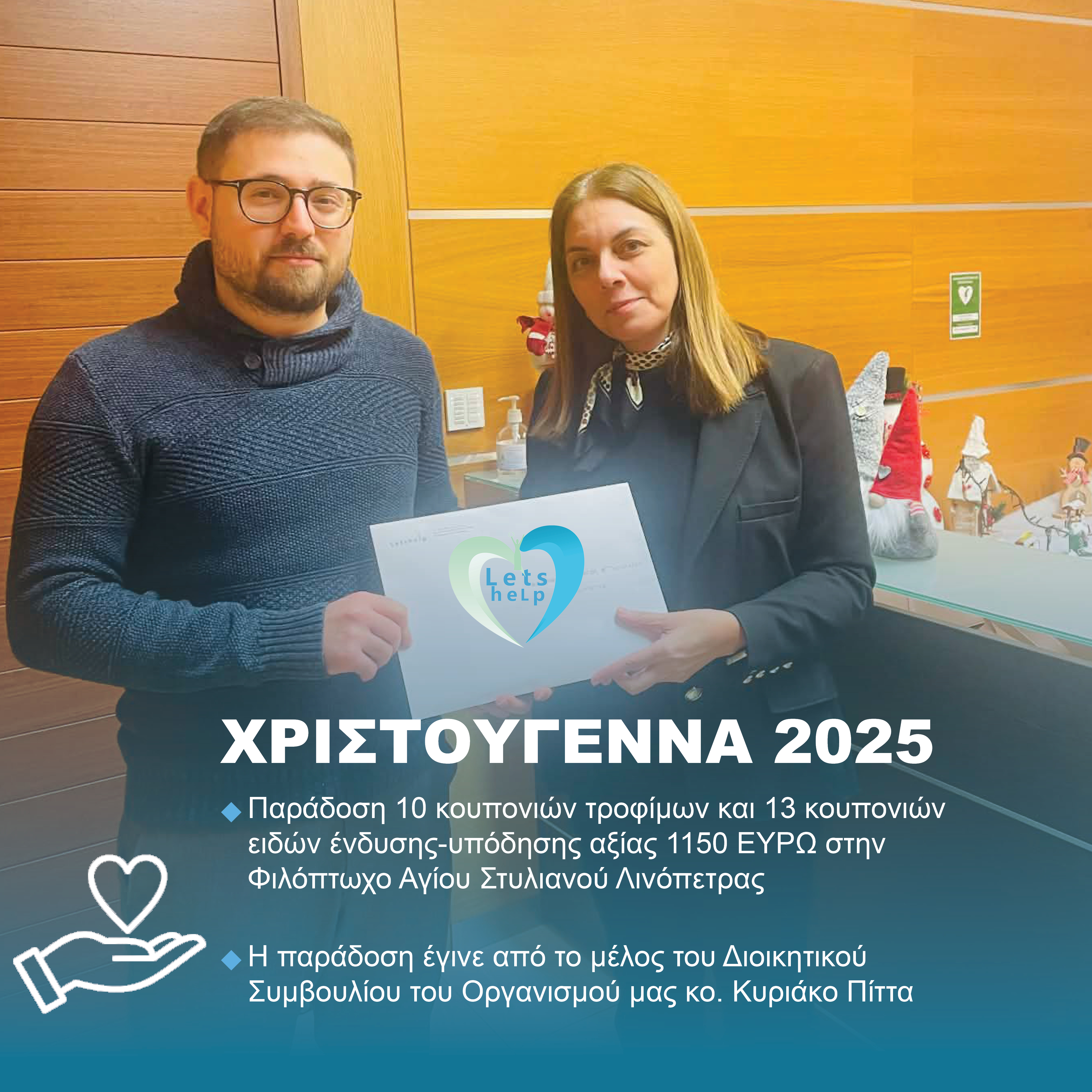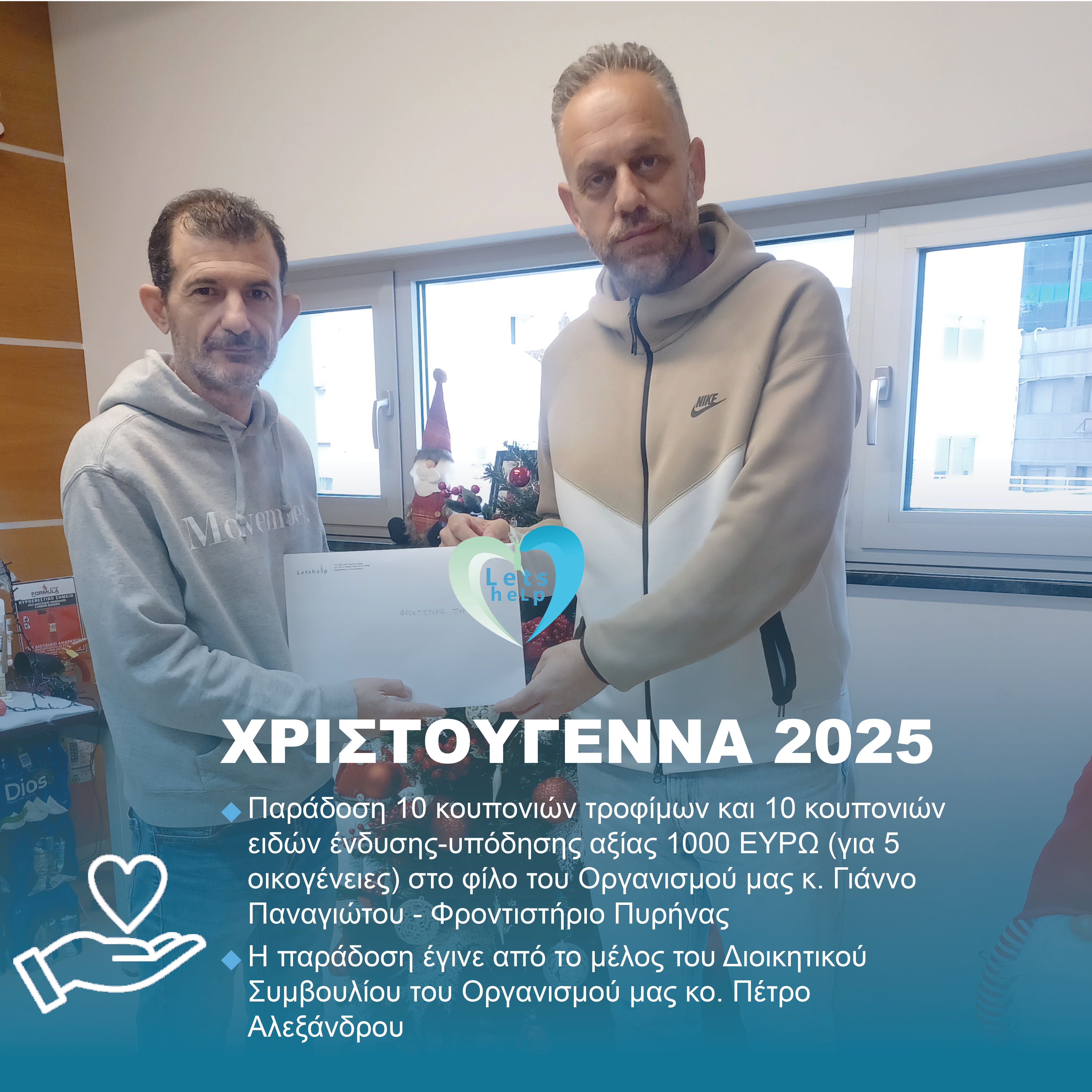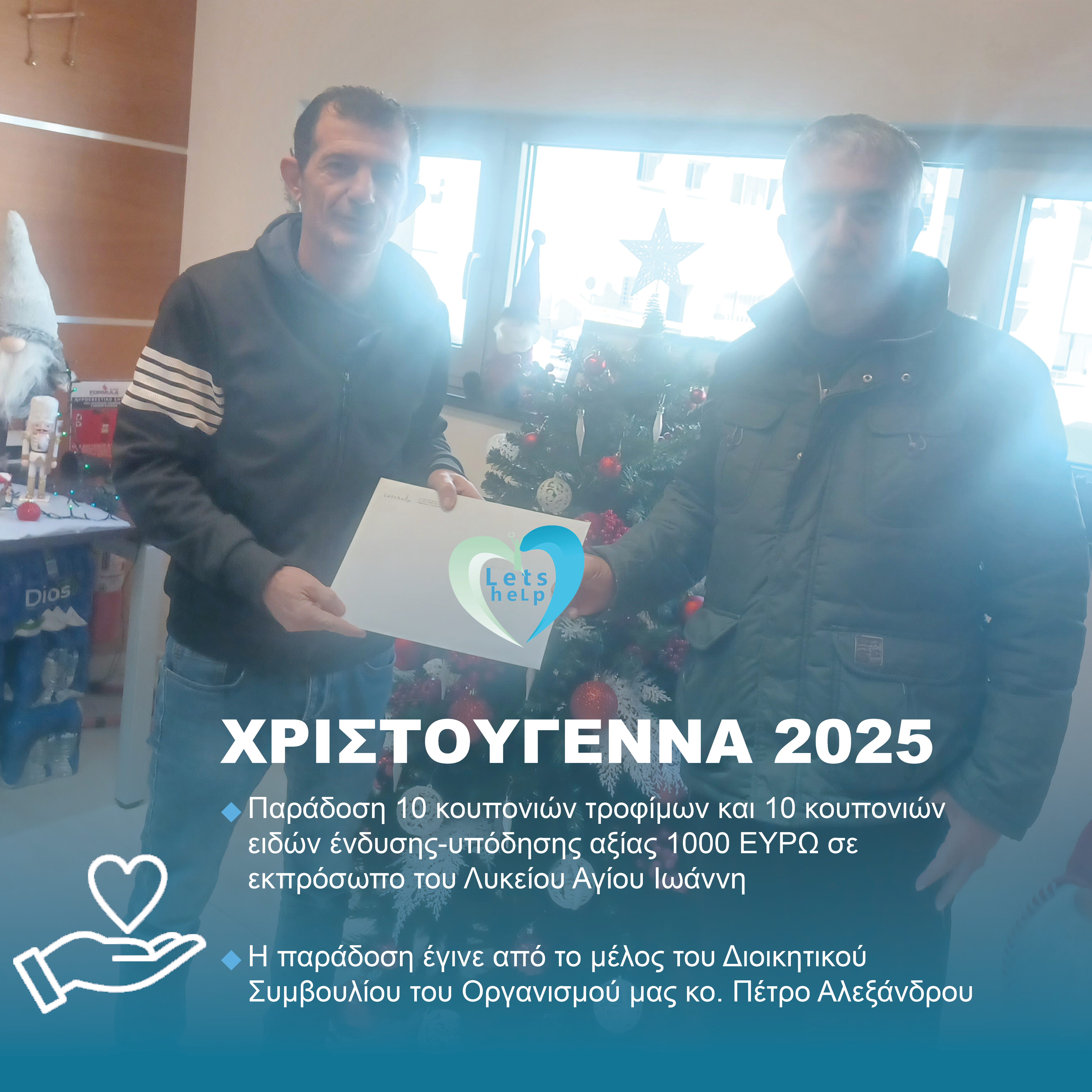 Στο πνεύμα των Άγιων Ημερών και με βαθύ αίσθημα ευθύνης απέναντι στον συνάνθρωπο, ο Οργανισμός LETSHELP πραγματοποίησε και φέτος την καθιερωμένη παράδοση δωροκουπονιών τροφίμων σε οικογένειες που αντιμετωπίζουν σοβαρές οικονομικές δυσκολίες.