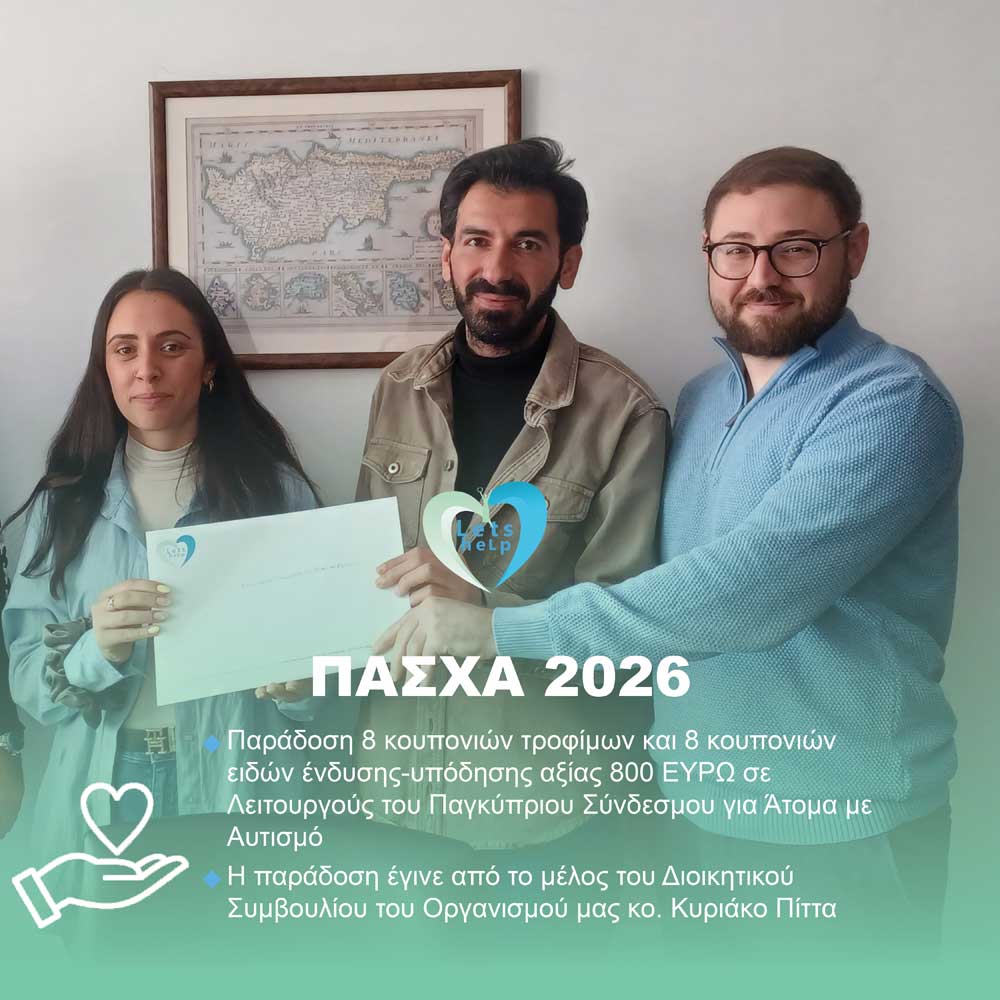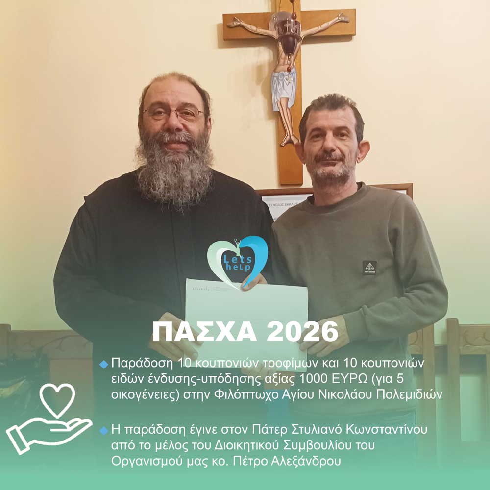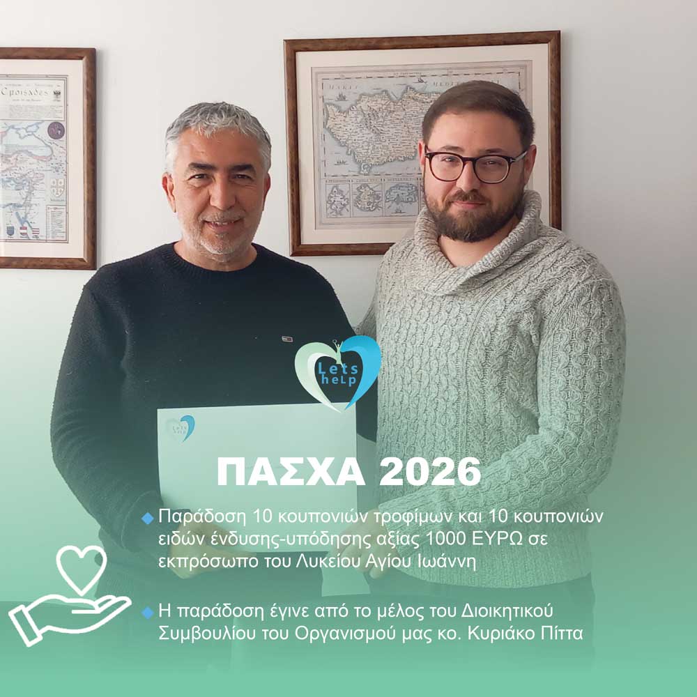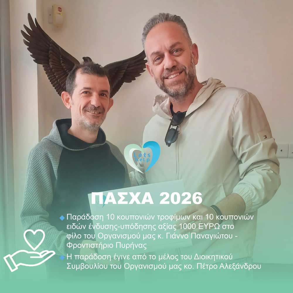 Στο πνεύμα των Άγιων Ημερών του Πάσχα και με αίσθημα ευθύνης απέναντι στον συνάνθρωπο, ο Οργανισμός LETSHELP πραγματοποίησε την καθιερωμένη παράδοση δωροκουπονιών τροφίμων σε οικογένειες που αντιμετωπίζουν σοβαρές οικονομικές δυσκολίες.